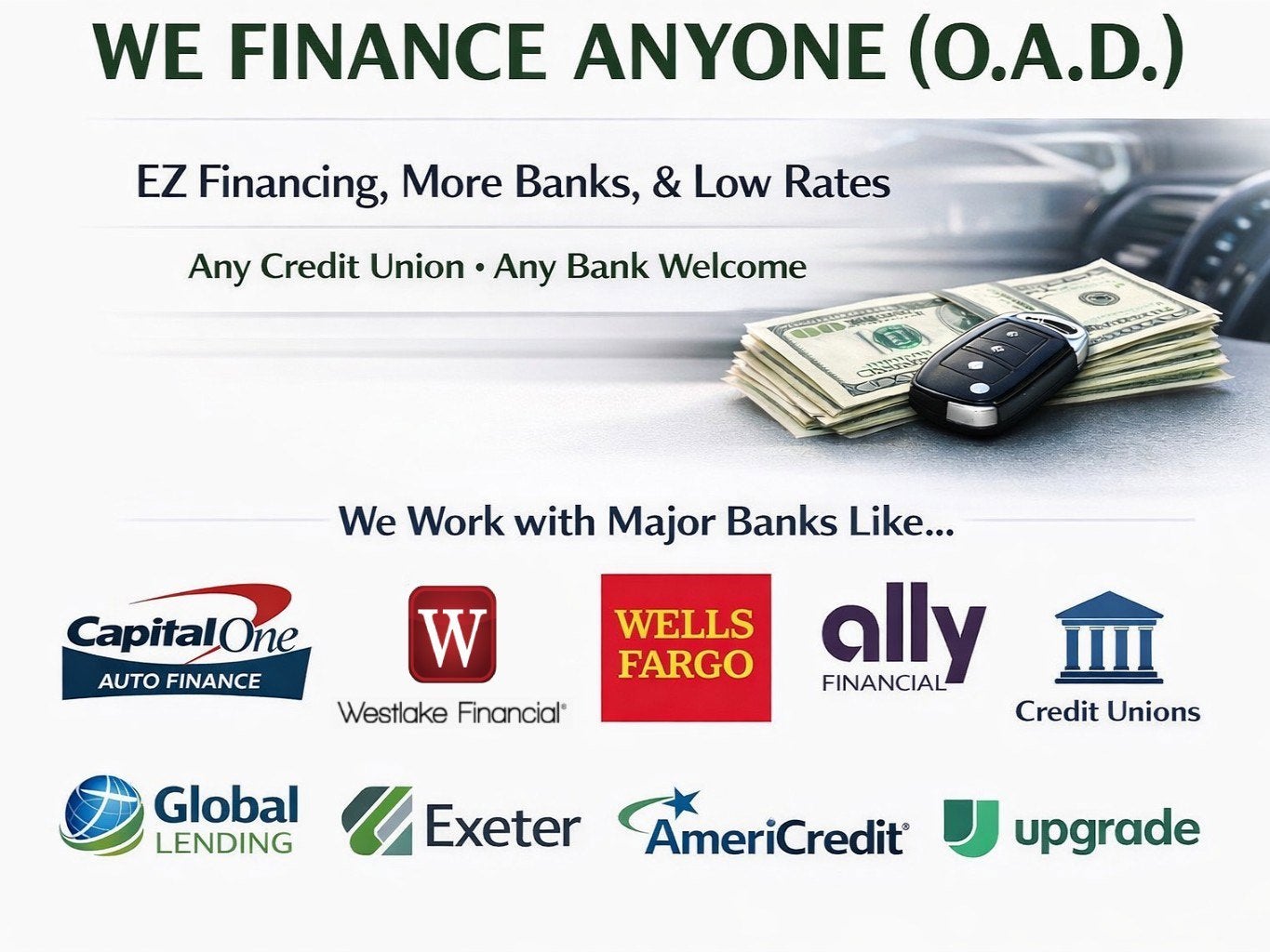 All advertised prices exclude government fees and taxes, any finance charges, any dealer document processing charge, any electronic filing charge, and any emission testing charge. Price and Equipment-We make every effort to present information that is accurate. The pricing, equipment, specifications, and photos shown above are believed to be accurate, but are provided "AS IS" and are subject to change without notice. We do not warrant or guarantee such accuracy. Fuel economy figures shown are provided from EPA mileage estimates and may not be comparable across different model years. Your actual mileage will vary, depending on specific options selected, how you maintain the vehicle and your personal driving habits. Vehicle specific information is based off standard equipment, and therefore exact configuration, color, specifications, and accessories should be used as a guide only. Certain offers may not be combined with others. Any original Manufacturer Warranty listed is believed to be accurate for new vehicles, but we do not warrant nor guarantee its accuracy or applicability to pre-owned vehicles. Some, but not all, of any remaining original Manufacturer Warranty may or may not be transferable to pre-owned vehicles (depending on the vehicle and Manufacturer). Prices are not binding without an executed contract at the dealership and are subject to change due to various factors such as Market Demand, Inventory levels or unexpected repairs within 24 hours. To ensure your complete satisfaction, we strongly advise, as it is your responsibility to verify with the dealer that all the details listed, including complete vehicle specification and price are accurate, vehicle location and availability preferably before visiting our location. Please call or email. Financing- We finance anyone (O.A.D.) On approved down payment. Rates as low as 6.99% rate based on lender criteria (may vary due to current market rate conditions), vehicle restrictions, not all customers will qualify.