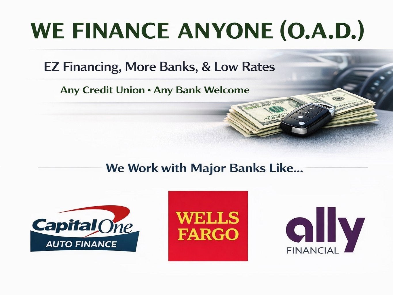 All advertised prices exclude government fees and taxes, any finance charges, any dealer document processing charge, any electronic filing charge, and any emission testing charge. Price and Equipment-We make every effort to present information that is accurate. The pricing, equipment, specifications, and photos shown above are believed to be accurate, but are provided "AS IS" and are subject to change without notice. We do not warrant or guarantee such accuracy. Fuel economy figures shown are provided from EPA mileage estimates and may not be comparable across different model years. Your actual mileage will vary, depending on specific options selected, how you maintain the vehicle and your personal driving habits. Vehicle specific information is based off standard equipment, and therefore exact configuration, color, specifications, and accessories should be used as a guide only. Certain offers may not be combined with others. Any original Manufacturer Warranty listed is believed to be accurate for new vehicles, but we do not warrant nor guarantee its accuracy or applicability to pre-owned vehicles. Some, but not all, of any remaining original Manufacturer Warranty may or may not be transferable to pre-owned vehicles (depending on the vehicle and Manufacturer). Prices are not binding without an executed contract at the dealership and are subject to change due to various factors such as Market Demand, Inventory levels or unexpected repairs within 24 hours. To ensure your complete satisfaction, we strongly advise, as it is your responsibility to verify with the dealer that all the details listed, including complete vehicle specification and price are accurate, vehicle location and availability preferably before visiting our location. Please call or email. Financing- We finance anyone (O.A.D.) On approved down payment. Rates as low as 6.99% rate based on lender criteria (may vary due to current market rate conditions), vehicle restrictions, not all customers will qualify.